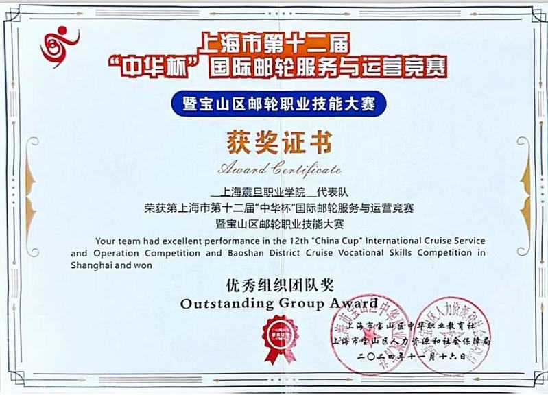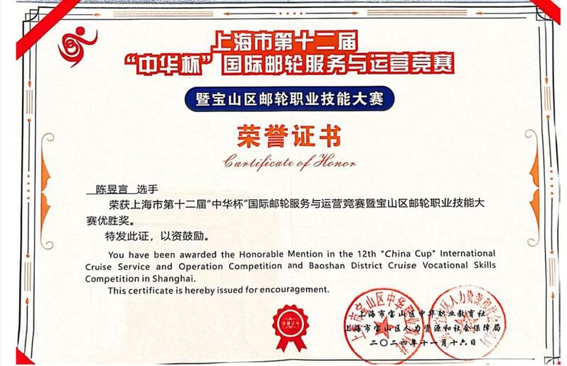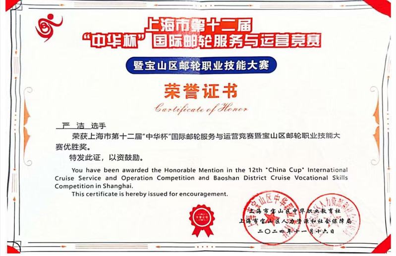 在上海市第十二屆“中華杯”國(guó)際郵輪服務(wù)與運(yùn)營(yíng)競(jìng)賽暨寶山區(qū)郵輪職業(yè)技能大賽中,我校經(jīng)濟(jì)管理學(xué)院2022級(jí)酒店管理與數(shù)字化高本貫通1班陳昱言和2023級(jí)空中乘務(wù)1班嚴(yán)潔分別榮獲優(yōu)勝獎(jiǎng)。