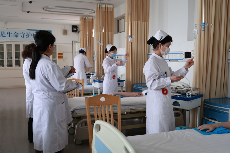 參賽選手按照抽簽順序,依次進(jìn)行自我介紹、核對醫(yī)囑、評估病人與環(huán)境、進(jìn)行手部消毒并佩戴口罩等流程,隨后回到治療室,將治療車推至病房進(jìn)行輸液,輸液結(jié)束后核對信息拔針,并整理記錄。選手們?yōu)椴∪诉M(jìn)行注射時親切的問候,動作規(guī)范、技術(shù)嫻熟、嚴(yán)格做到“三查八對”,與患者保持了良好的溝通。