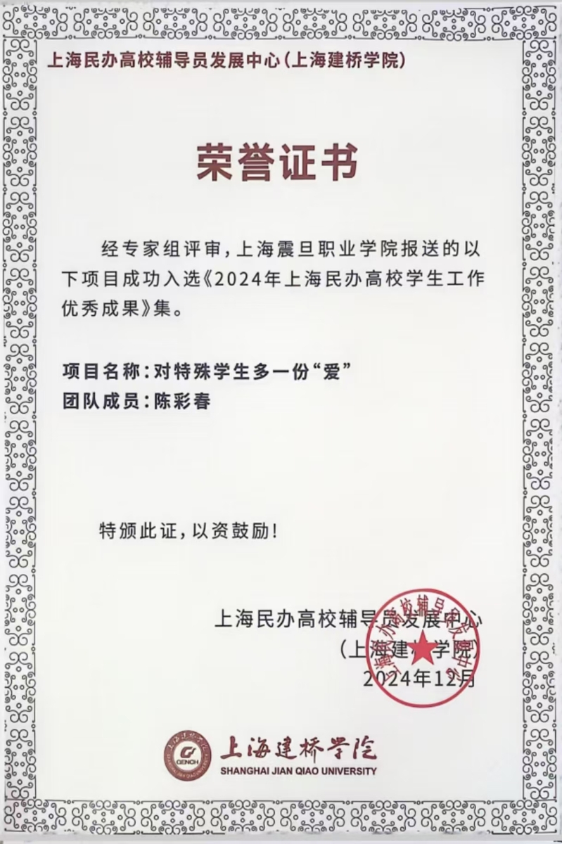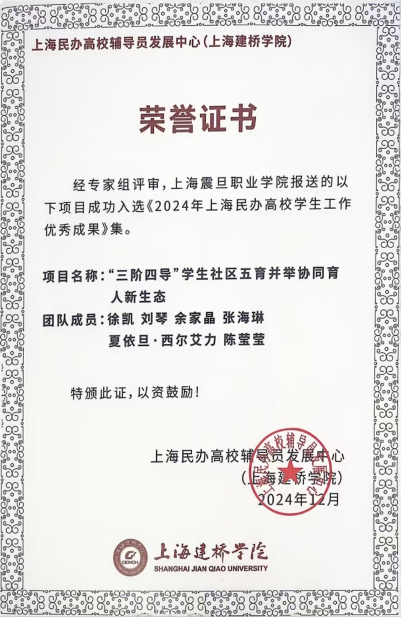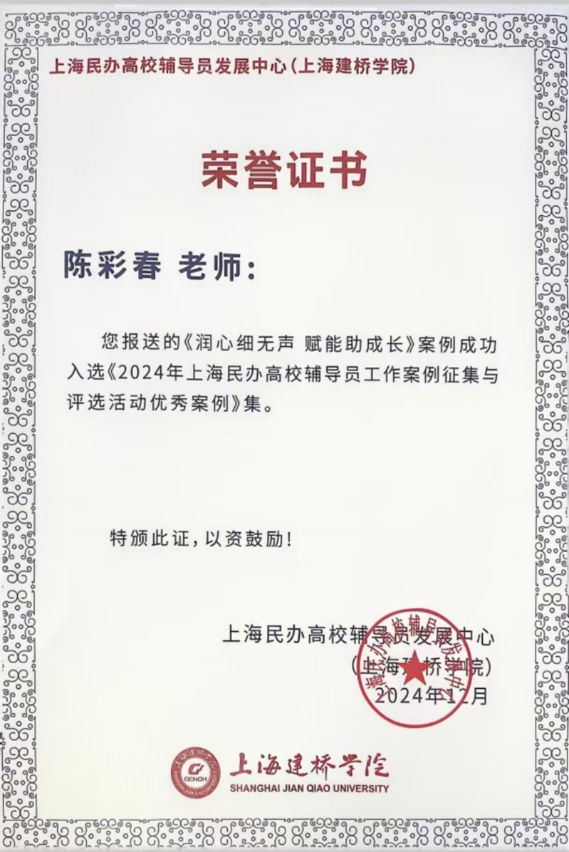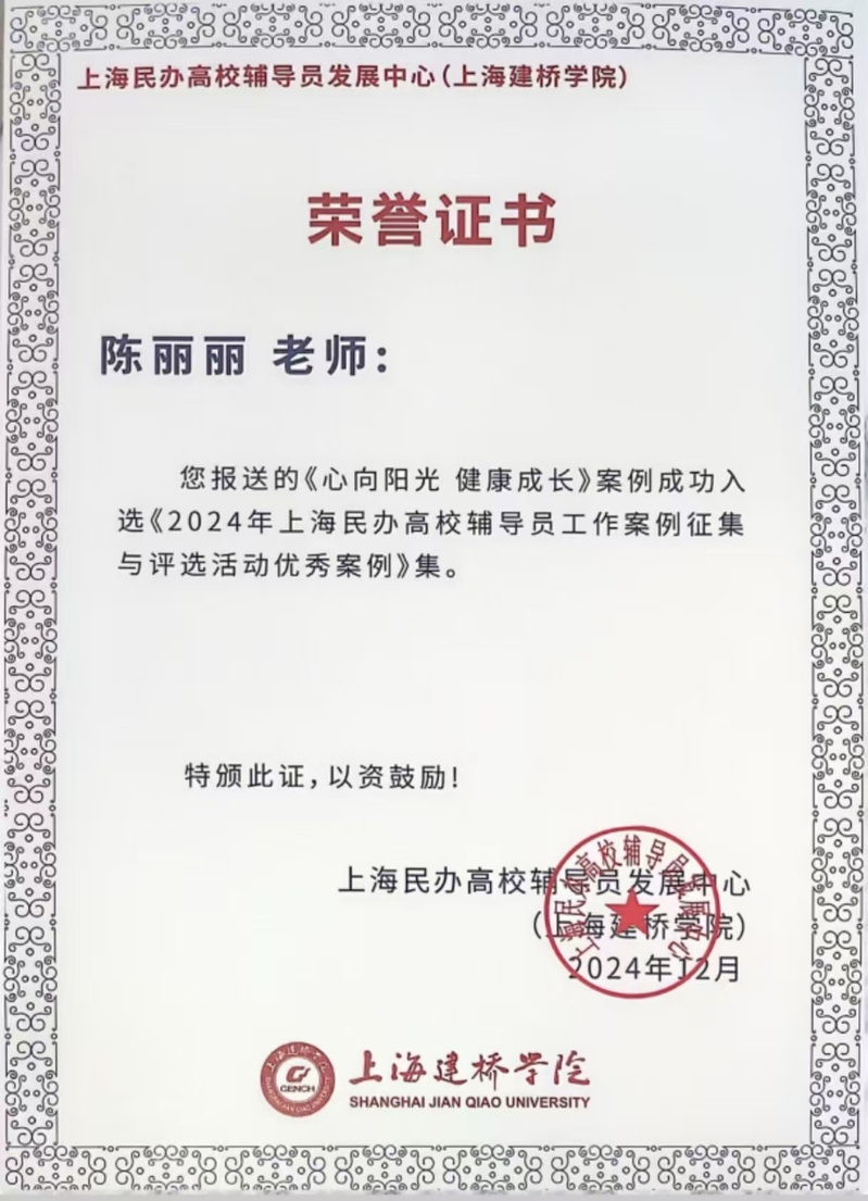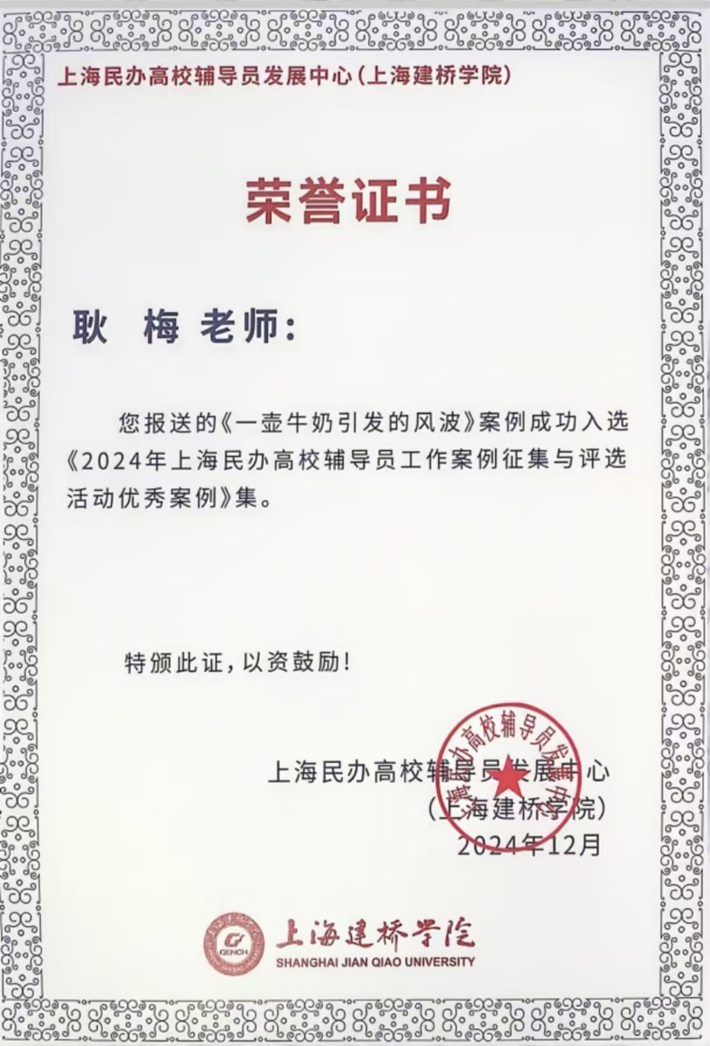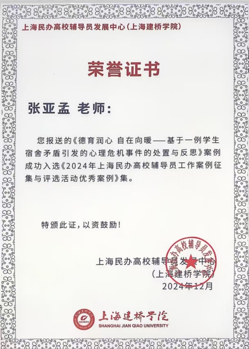 會上,上海民辦高校黨工委與上海民辦高校輔導(dǎo)員發(fā)展中心為入編(選)案例成果的輔導(dǎo)員頒發(fā)了榮譽證書。我校輔導(dǎo)員耿梅的《一壺牛奶引發(fā)的風(fēng)波》、張亞孟的《德育潤心自在向曖-----基于一例學(xué)生宿舍矛盾引發(fā)的心理危機事件的處置與反思》、陳麗麗的《心向陽光 健康成長》、陳彩春的《潤心細無聲賦能助成長》《對特殊學(xué)生多一份“愛”》,以及徐凱的《“三階四導(dǎo)”學(xué)生社區(qū)五育并舉育人新生態(tài)》等案例論文,在群賢匯聚、案例成果眾多的評審中以較高的理論水平和可借鑒復(fù)制的典型做法,成功入選《上海民辦高校輔導(dǎo)員工作案例集》和《上海民辦高校學(xué)生工作優(yōu)秀成果集》。其中,《2024年上海民辦高校輔導(dǎo)員工作案例集》編入的全市8所民辦高校20篇輔導(dǎo)員工作案例中,我校入選4篇,占比五分之一,成為輔導(dǎo)員人均案例入選最高的學(xué)校。