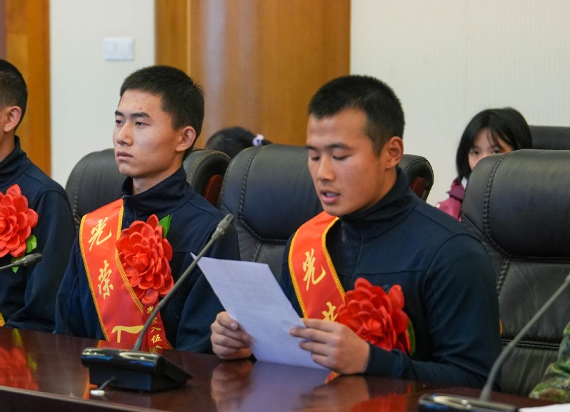 新兵代表胡選鵬發(fā)言。他表示,定會堅守初心、刻苦訓練,將自己的拳拳愛國之心化為錚錚報國之行,以堅韌不拔的意志迎接挑戰(zhàn),以勇往直前的姿態(tài)書寫輝煌,以不屈不撓的精神捍衛(wèi)國土,綻放軍人的風采與輝煌。