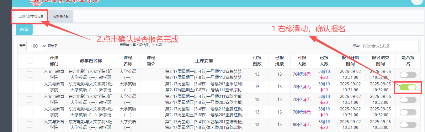 8.查看可報名教學(xué)班信息,選擇報名的教學(xué)班,右移滑動確認(rèn)報名(注意:每門課程限報名一個教學(xué)班),報名后再點擊“已加入教學(xué)班信息”
